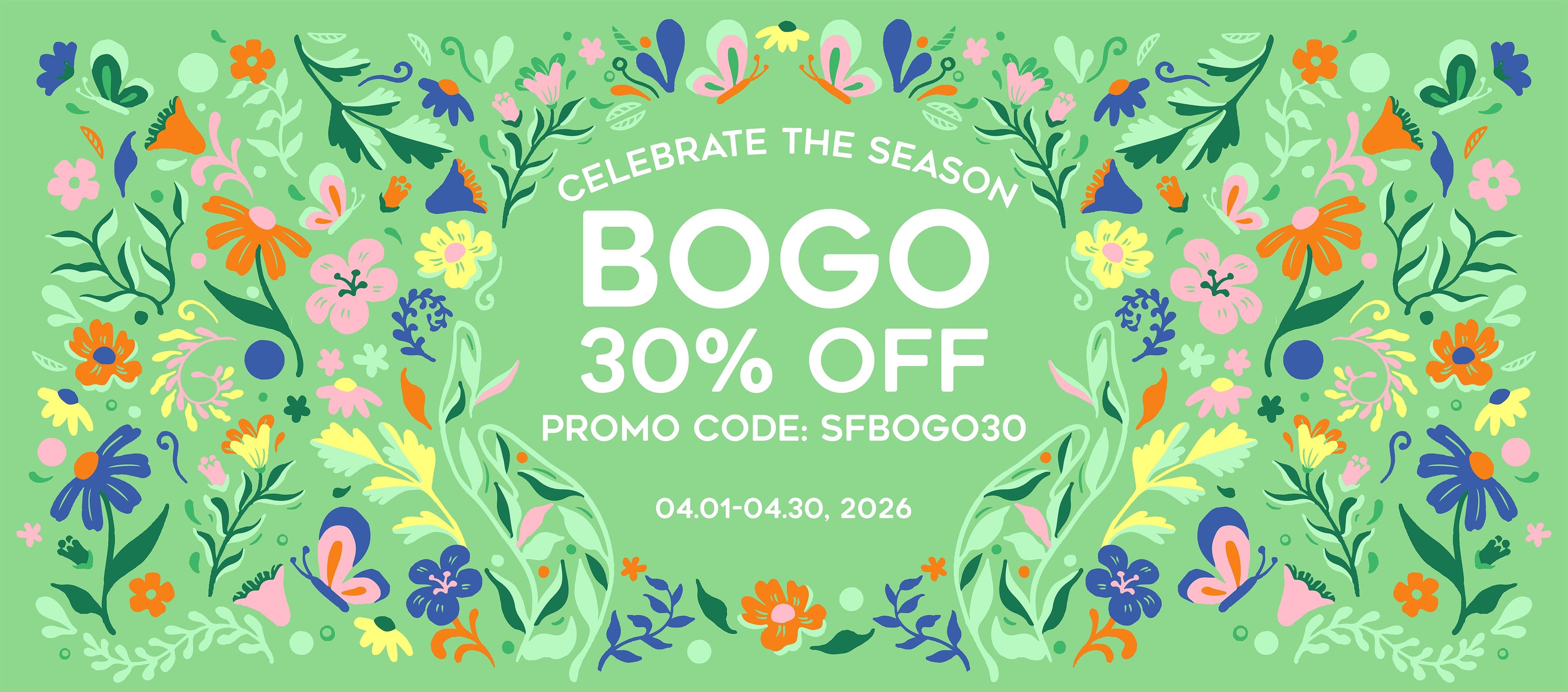 Use code SFBOGO30 for BOGO (Buy One, Get One) 30% April Sitewide Sale
