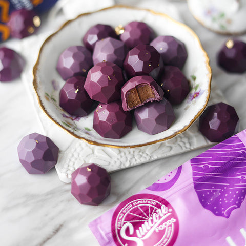 Never underestimate the power of chocolate! A day without chocolate is like a day without sunshine! These exquisite royal purple hue Chocolate with Creamy Hazelnut Praliné Chocolate Filling can immediately brighten your Friday & weekend ahead. Take a bite into this smooth and crispy deliciousness and let your mouth fill with Creamy hazelnut praline chocolate filling. Mmmmmmmmm, it's a match made in heaven! Use Suncore Foods® Lilac Taro Yam & Ebony Carrot Powders to achieve this delightful royal purple hue and elevate your table. Good chocolate, good mood!
