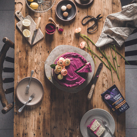 Happiness starts with a slice of this delicious Lemon Poppyseed Cake with Ebony Carrot Buttercream Frosting. Serve this truly stunning and moist cake at your next gathering, and your guests will be begging you for the recipe. It's loaded with poppy seeds for that delightful crunch and a hint of lemon, enrobed in a rich, deeply romantic, creamy buttercream frosting. Delicious! Recreate this dreamy cake with Suncore Foods® Ebony Carrot Powder and add some color to your table. Eat, sleep and stay happy.