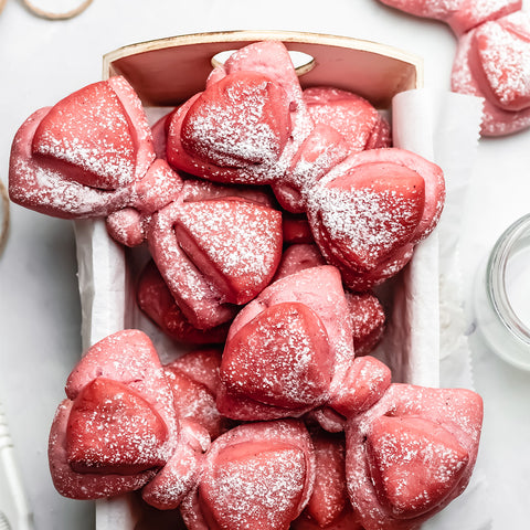 Tied together in a perfect bow, these Pink Pitaya Fluffy Bow Tie Buns are a sweet treat that instantly emits happiness into our day! These are so adorable, yummy, and make a pretty pink by using our Suncore Foods® Pink Pitaya Powder & Suncore Foods® Red Beet Powder! Baked to the perfect fluffiness, no one will be able to stop eating these once they taste how soft and pillowy these buns are. If you want to get a taste of these cushiony treats, be sure to grab a bag or two of our powders.