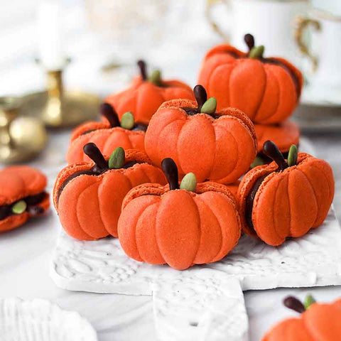 After finishing off our leftover pumpkin pie, we're still fending for some pumpkin treats!  To satisfy our craving, these sweet, crispy, and chewy Pumpkin Macarons with Dark Chocolate Ganache hit the spot. These adorable little morsels of goodness are made with Suncore Foods® Cosmos Red Cabbage, Red Beet, Yellow Goldenberry Powders, filled with a rich, dark chocolate ganache filling. The ultimate treat for all ages and pairs wonderfully with a cup of tea or hot chocolate. We are completely embracing this pumpkin fever and never want to let go!