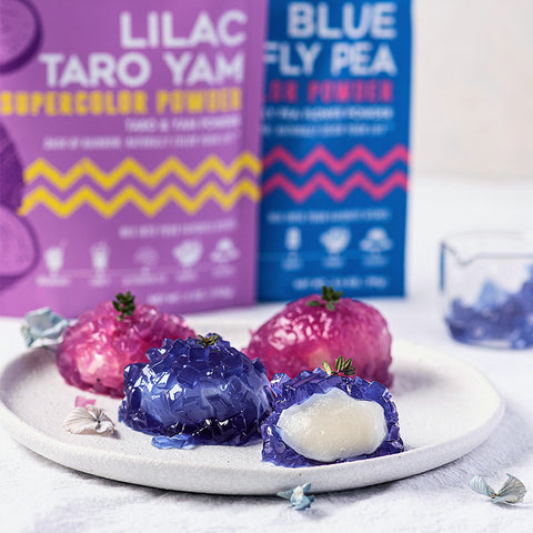 An amazing, soft & chewy magical Japanese sweet delicacy made with love and once you bite into them, your will be filed with its wondrous colors and flavors. Using Suncore Foods® Blue Butterfly Pea Powder and Suncore Foods® Lilac Taro Yam Powder to create a marvelously unique colors in these Raindrop Crystal Rainbow Wagashi (Mochi) and the end result is a surprisingly refreshing dish that absolutely make all our hearts fluster!