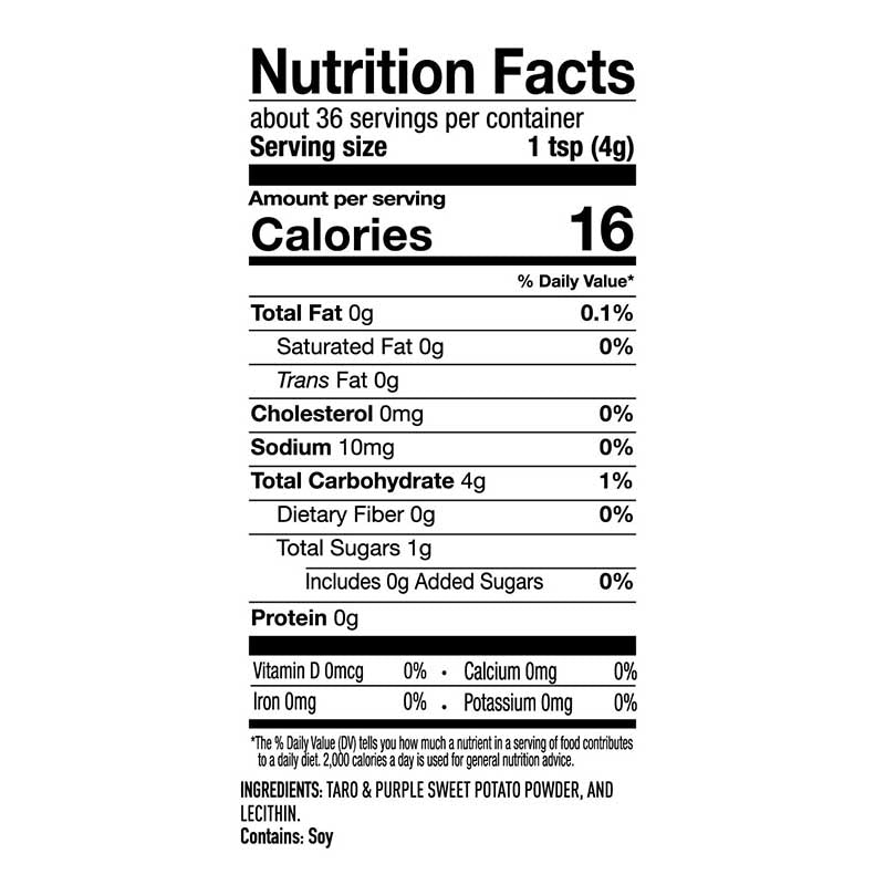 INGREDIENTS: Taro and Purple Sweet Potato Powder, Soy Lecithin.